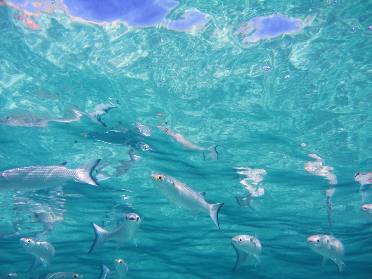 I am pretty certain that these are mullet. I cannot see any striping but the image is not great so I am assuming that they are white mullet. I am not close enough to count the anal fin rays which evidently is the best test between the types of mullets.